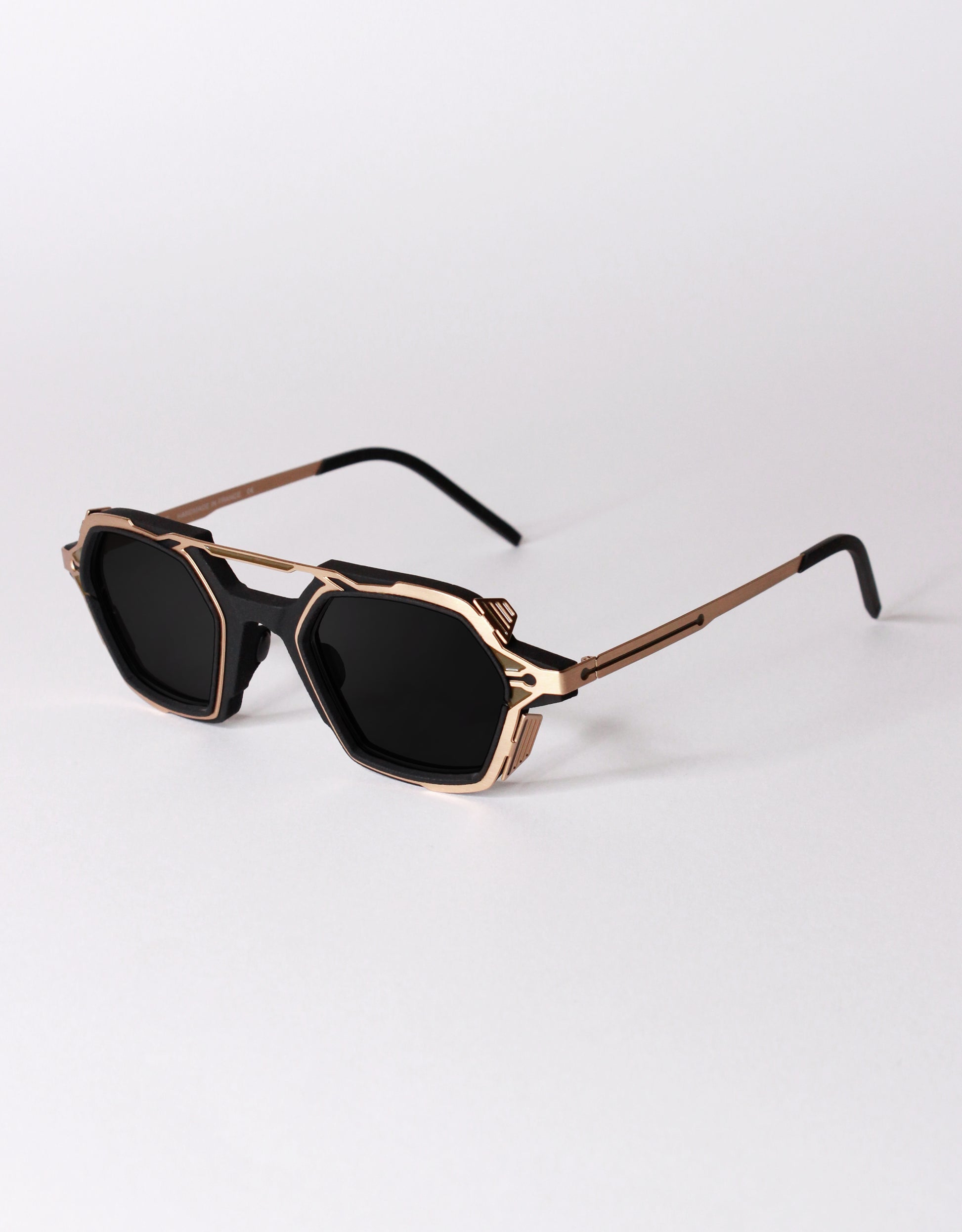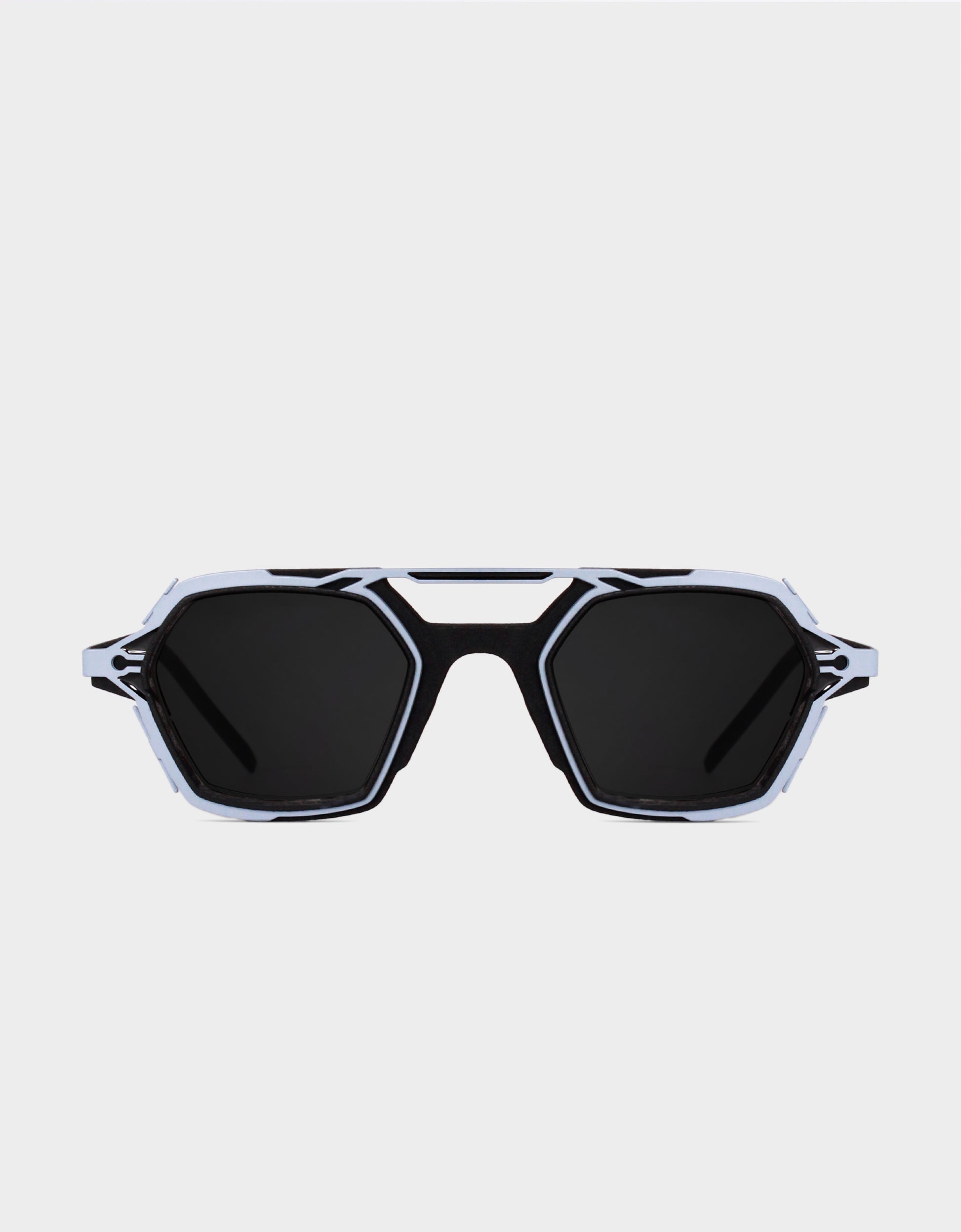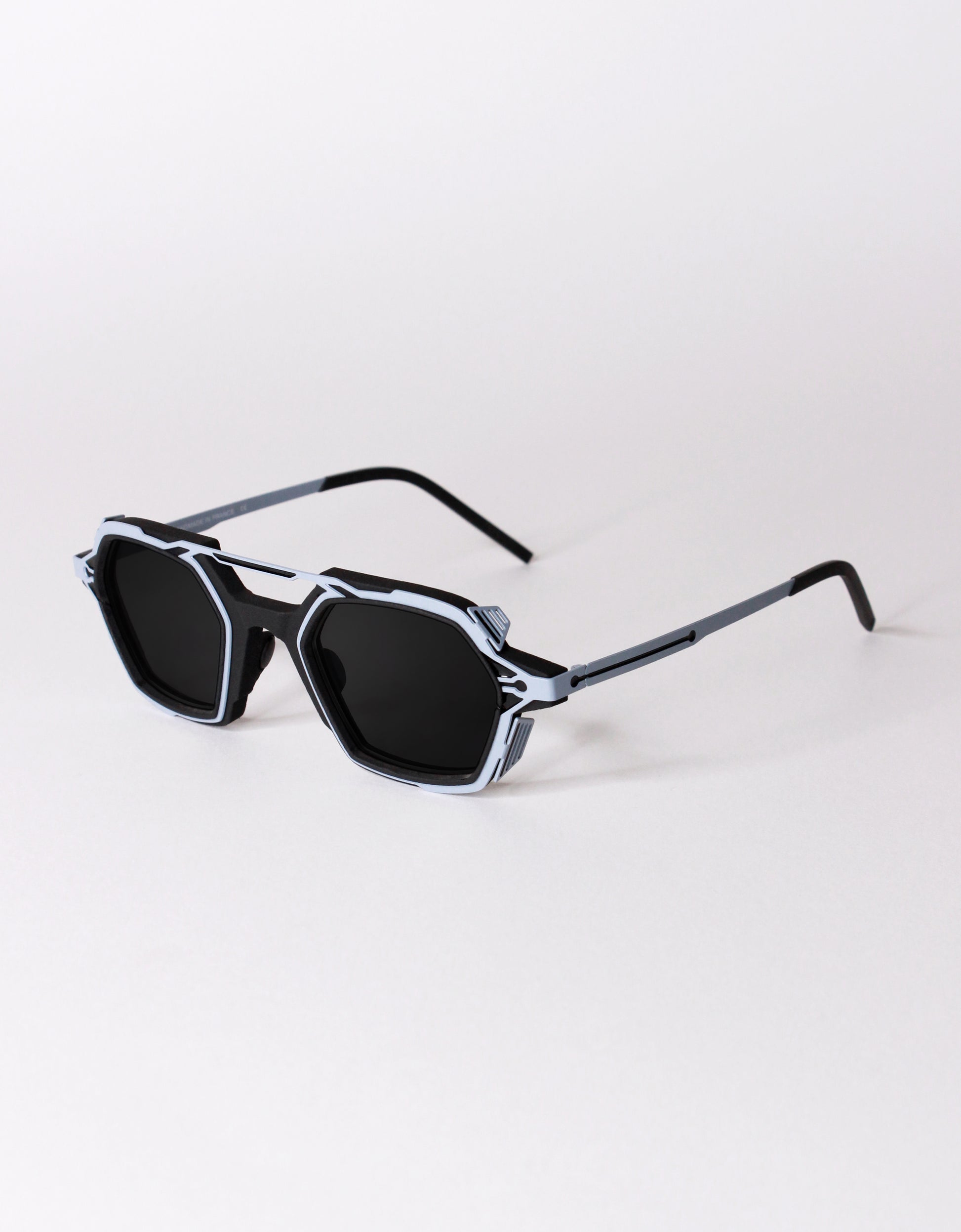 The Steelskin (medical stainless steel) is set up with profiled grids that create protection shields. This metal part is combined with an anti-matter front (3D printed polyamide material) that holds the lenses locked in the frame.